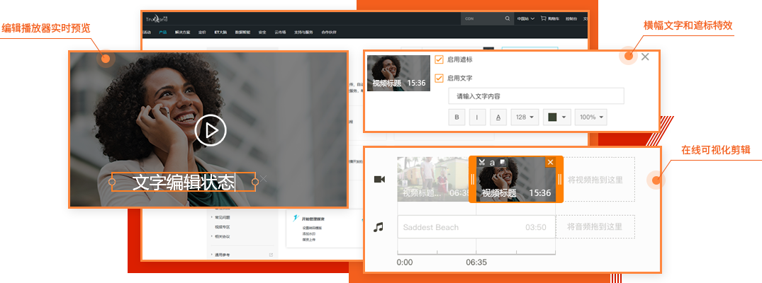 视频智能制作提供云端视频剪辑制作服务,提供在线可视化剪辑平台及丰富的OpenAPI,帮助客户高效处理、制作视频内容。除基础的剪切拼接、混音、遮标、特效、合成等一系列功能外,